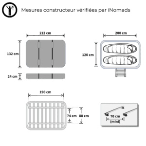Le choix de la taille (M / L) dépend de la longueur de toit réellement disponible, à mesurer haillon ouvert. - Barres de toit requisesBarres de toit transversales (acier ou aluminium), capables de supporter la charge dynamique totale, incluant le poids des barres, de la tente et des accessoires, conformément aux préconisations du constructeur du véhicule et des barres.